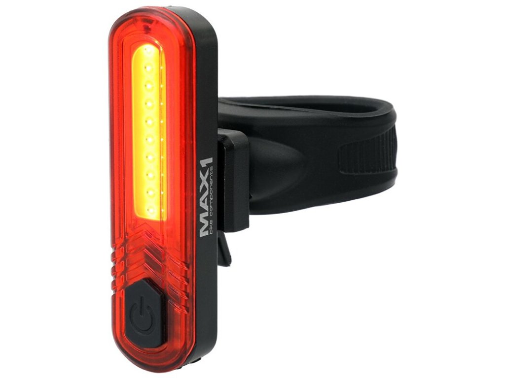 Ultralehká zadní USB blikačka MAX1 Cobo s 10 COB LED diodami a 8 světelnými režimy. Díky systému uchycení pomocí gumového držáku můžete blikačku namontovat na kolo, hůlky, kočárek, apod.