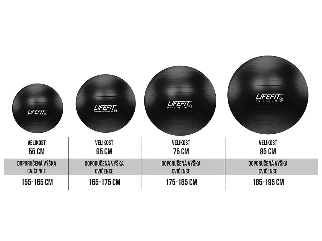 Gymnastický míč LIFEFIT ANTI-BURST 55 cm je míč z řady profesionálních gymnastických míčů. Míč LIFEFIT 55 cm je vyroben z vysoce pevného a odolného PVC materiálu s nosností 200 kg. Protiskluzová ochrana povrchu a systém ANTI-BURST (pomalé uvolňování vzduchu v případě přetlaku) zajištuje vysoký stupeň bezpečnosti a zdraví cvičence Série gymnastických míčů LIFEFIT je vyráběna v několika velikostech a barvách. Míče LIFEFIT jsou vhodné pro všestranné využití při fitness, kardio a rehabilitačních cvičeních. Míče jsou určeny pro komerční i soukromé využití.