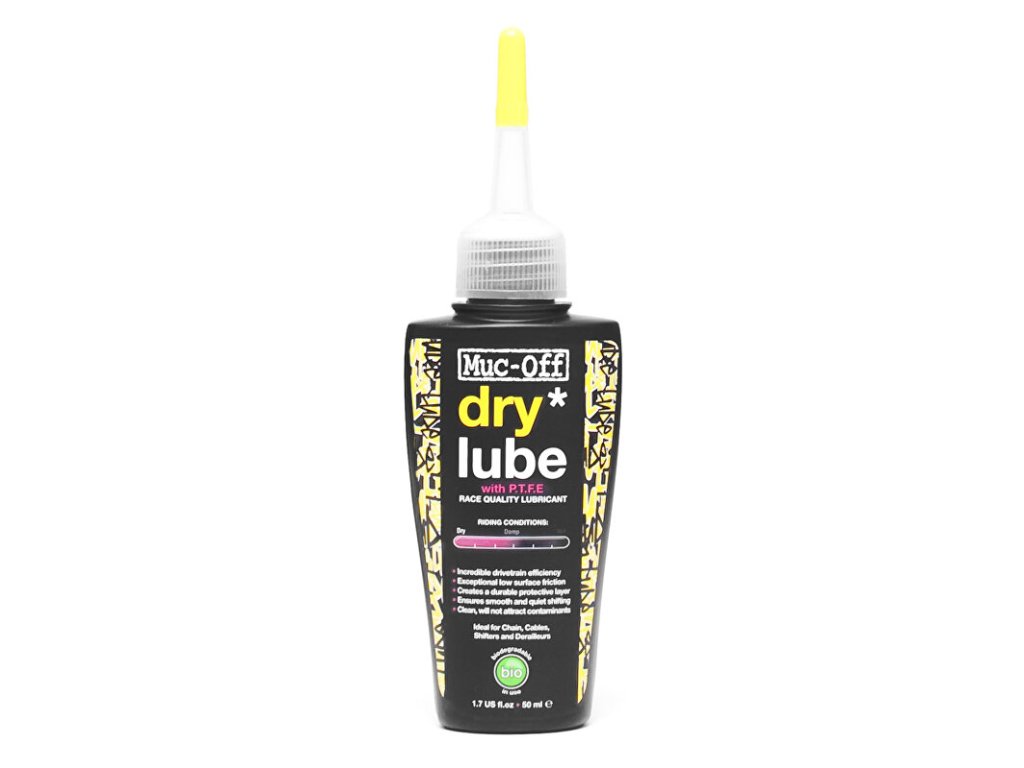 Muc Off Dry Lube Racing je velmi univerzální suché mazivo s P.T.F.E. (teflonovou) složkou pro použití v různorodých klimatických podmínkách. Teflonová složka díky své velmi nízké molekulární frikci zajišťuje hladkých chod řetězu i řazení. Muc-Off pokročilé suché složení umožňuje navíc vytvoření suché a trvanlivé ochranné vrstvy, která mazivo zapouzdří a omezuje ulpívání nečistot na povrchu ošetřených komponentů, zejména v suchém a prašném prostředí. V případě změny počasí však současně dokáže v závislosti na konkrétních podmínkách odolávat i vodě.