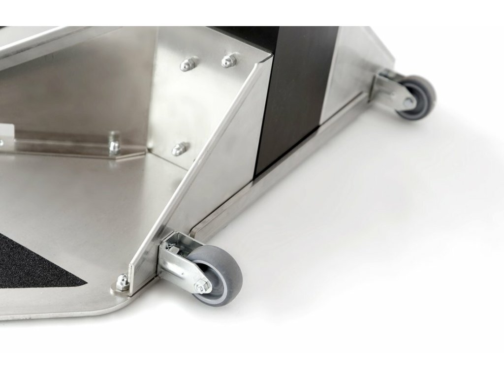 Produkt obsahuje: montážní stojan, základovou nerezovou desku, pevná kolečka, odkládací poličku na nářadí