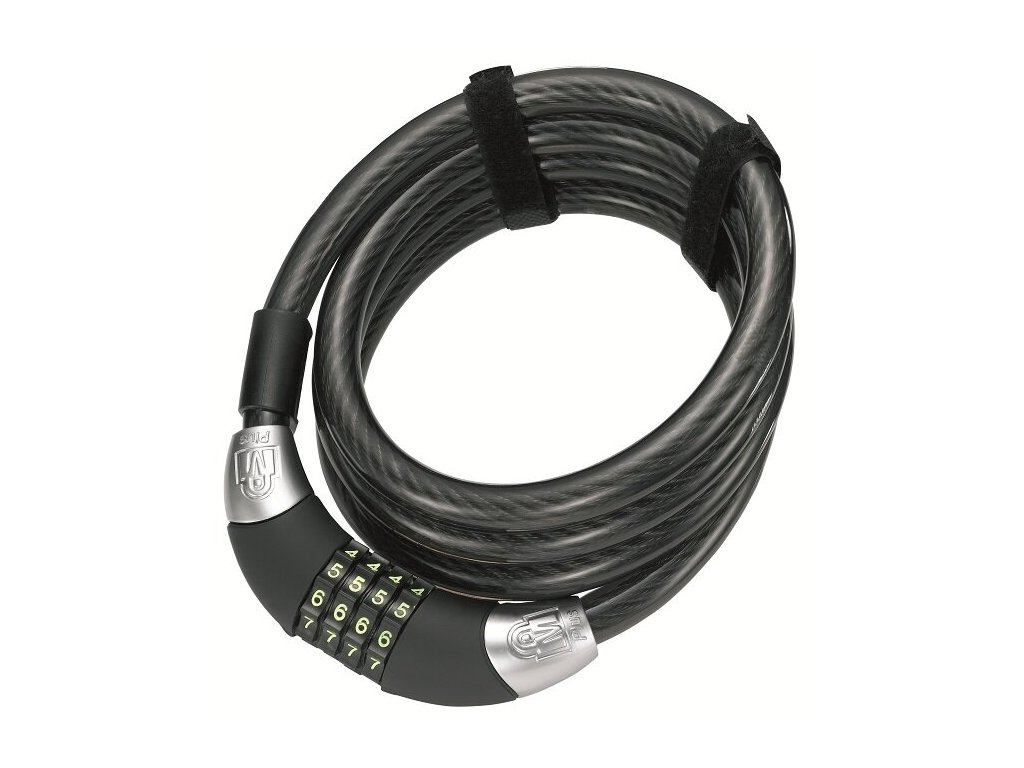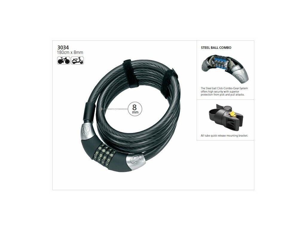 Kódový lankový zámek, 4-místný nastavitelný kód, délka180cm, ocelové tuhé lanko 10mm, universální držák, atraktivní balení.